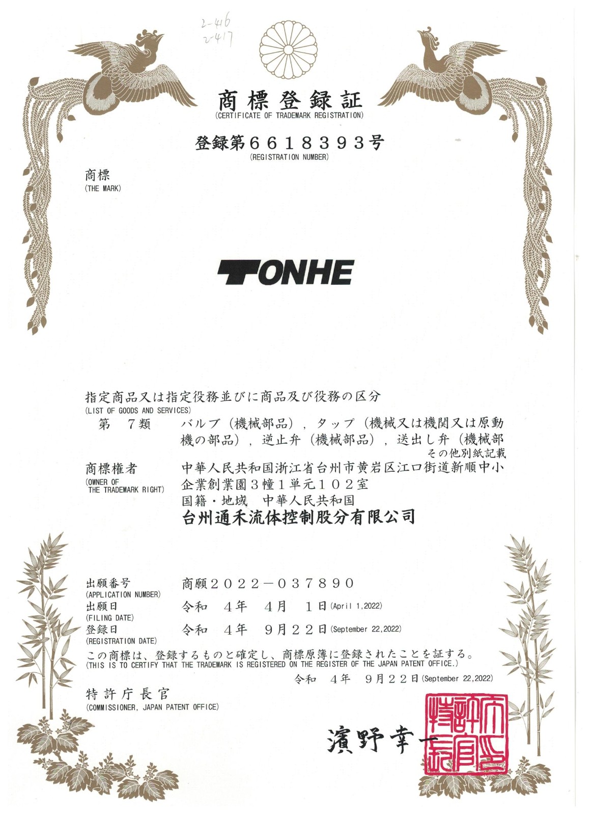 近日,我司台州通禾流体控制股份有限公司商标“TONHE”、“TONHEFLOW”在日本注册成功。